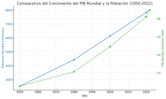 : Gráfico comparativo del crecimiento del PIB mundial y la población global entre 1950 y 2022. Se puede ver cómo ambas variables han crecido de manera significativa, aunque el PIB lo ha hecho a un ritmo aún más acelerado, lo que refleja un aumento en la productividad y el ingreso per cápita global.