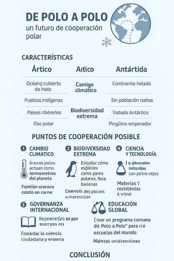 La conclusión: “Unir Ártico y Antártida en programas complementarios sería más que ciencia: sería un acto de supervivencia planetaria” deja un impacto fuerte, con tono de manifiesto. Perfecta para invitar a la acción.